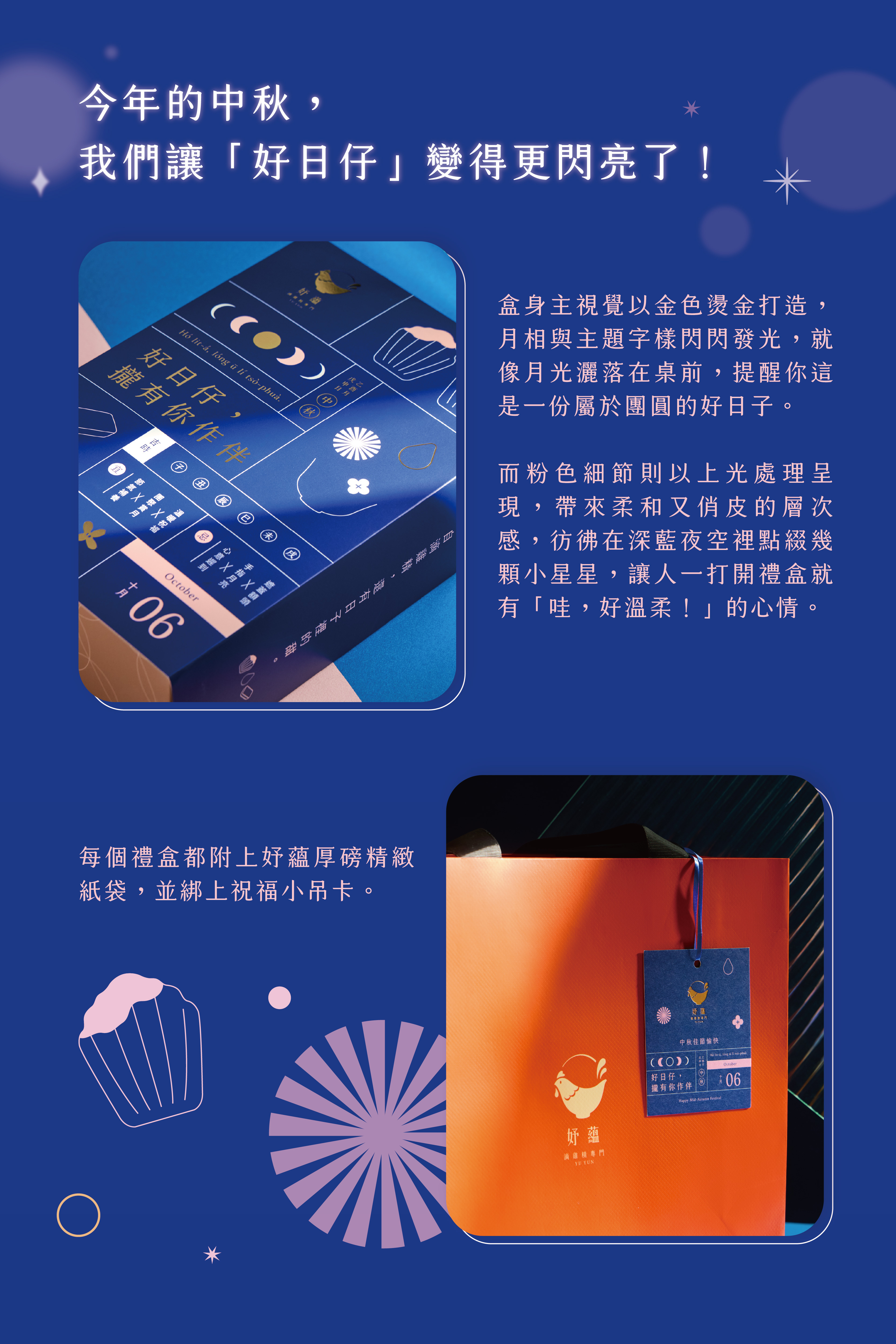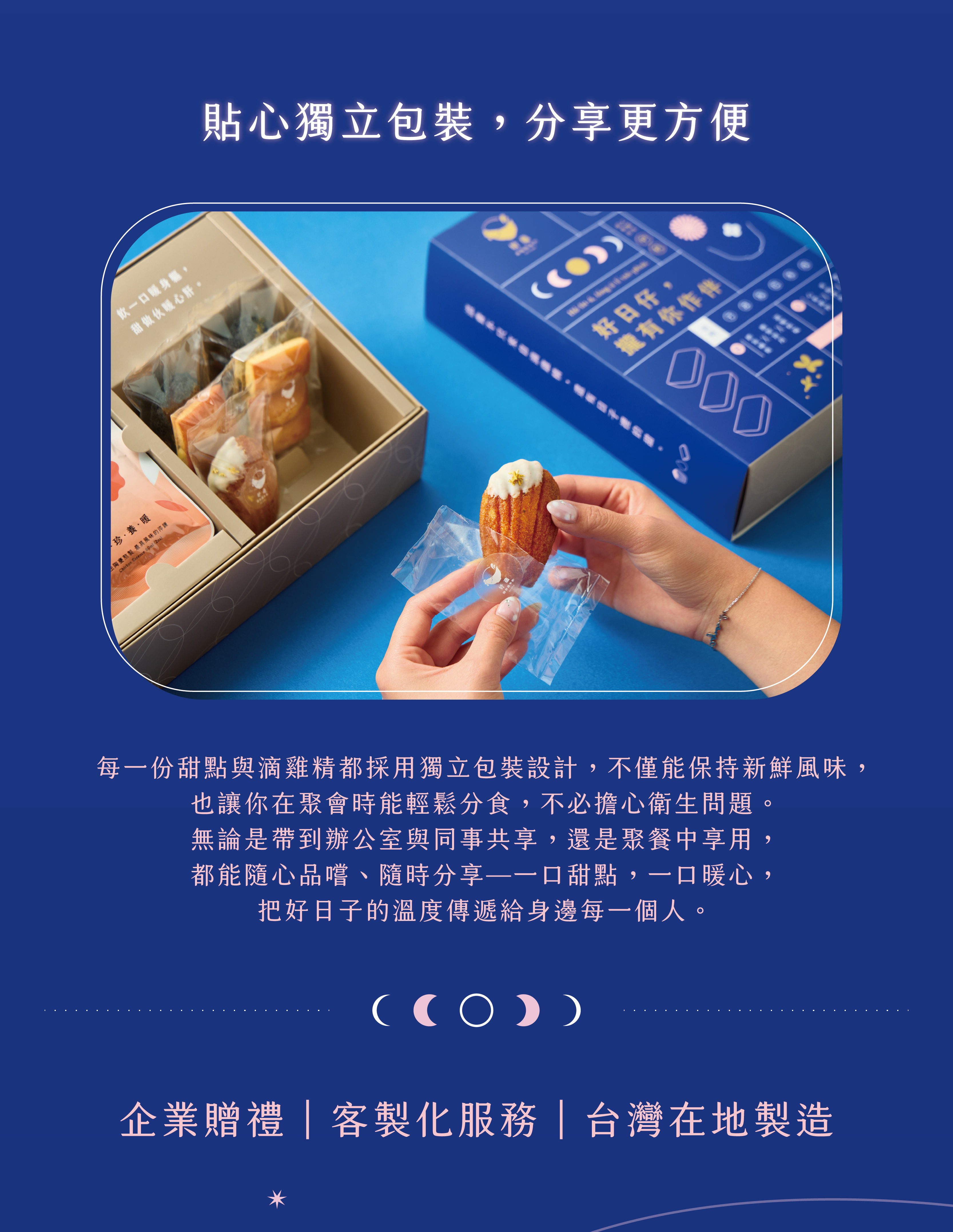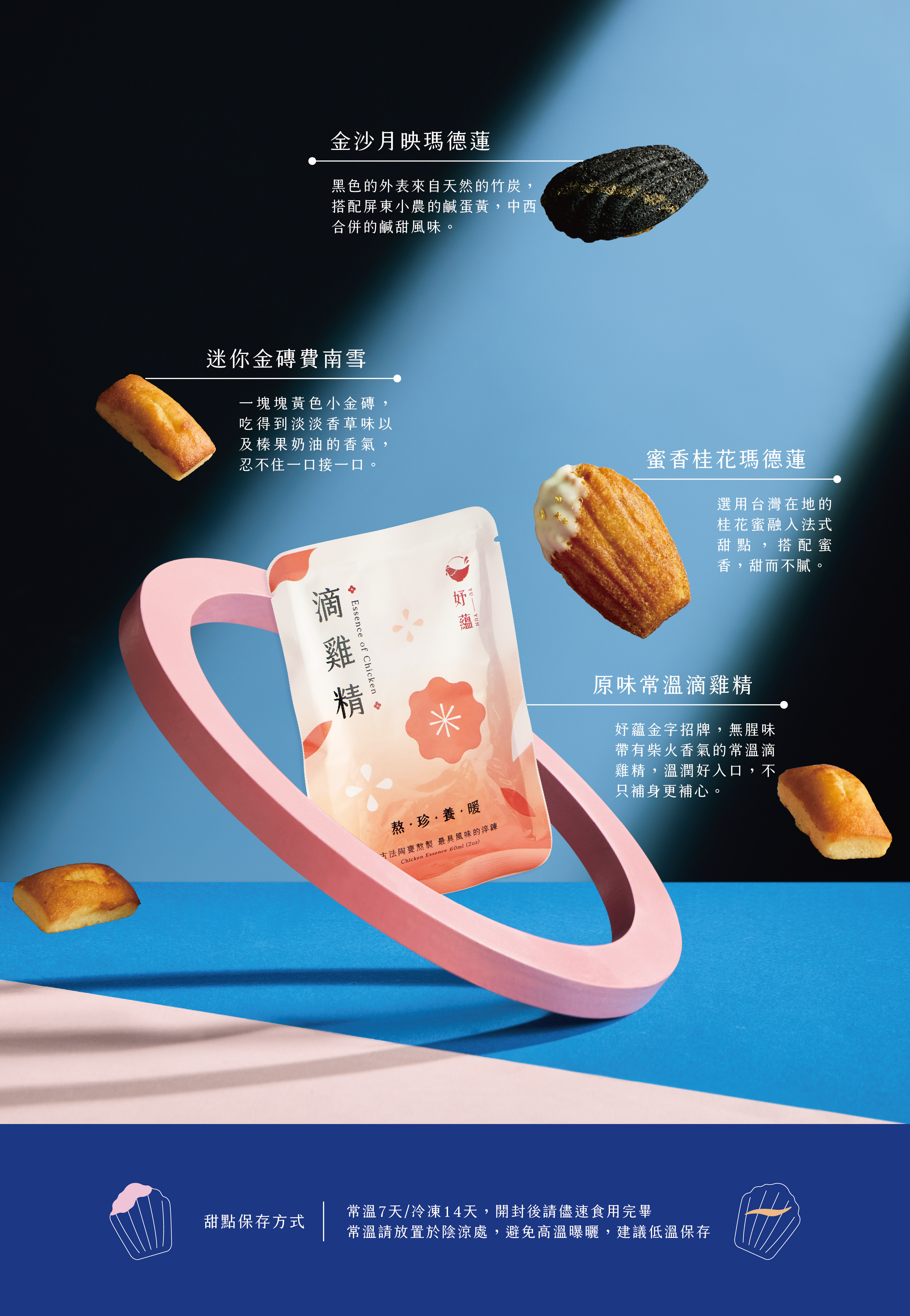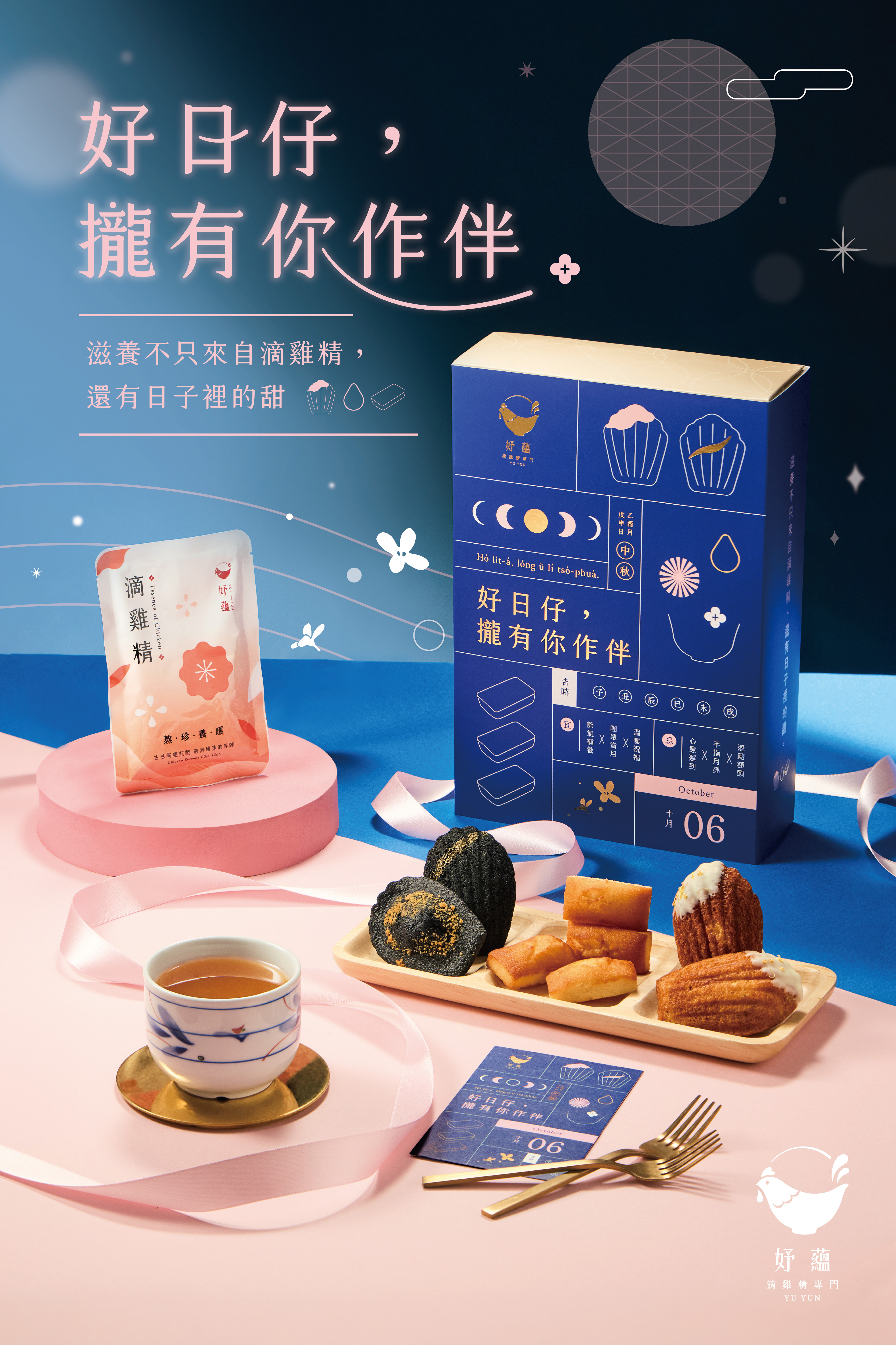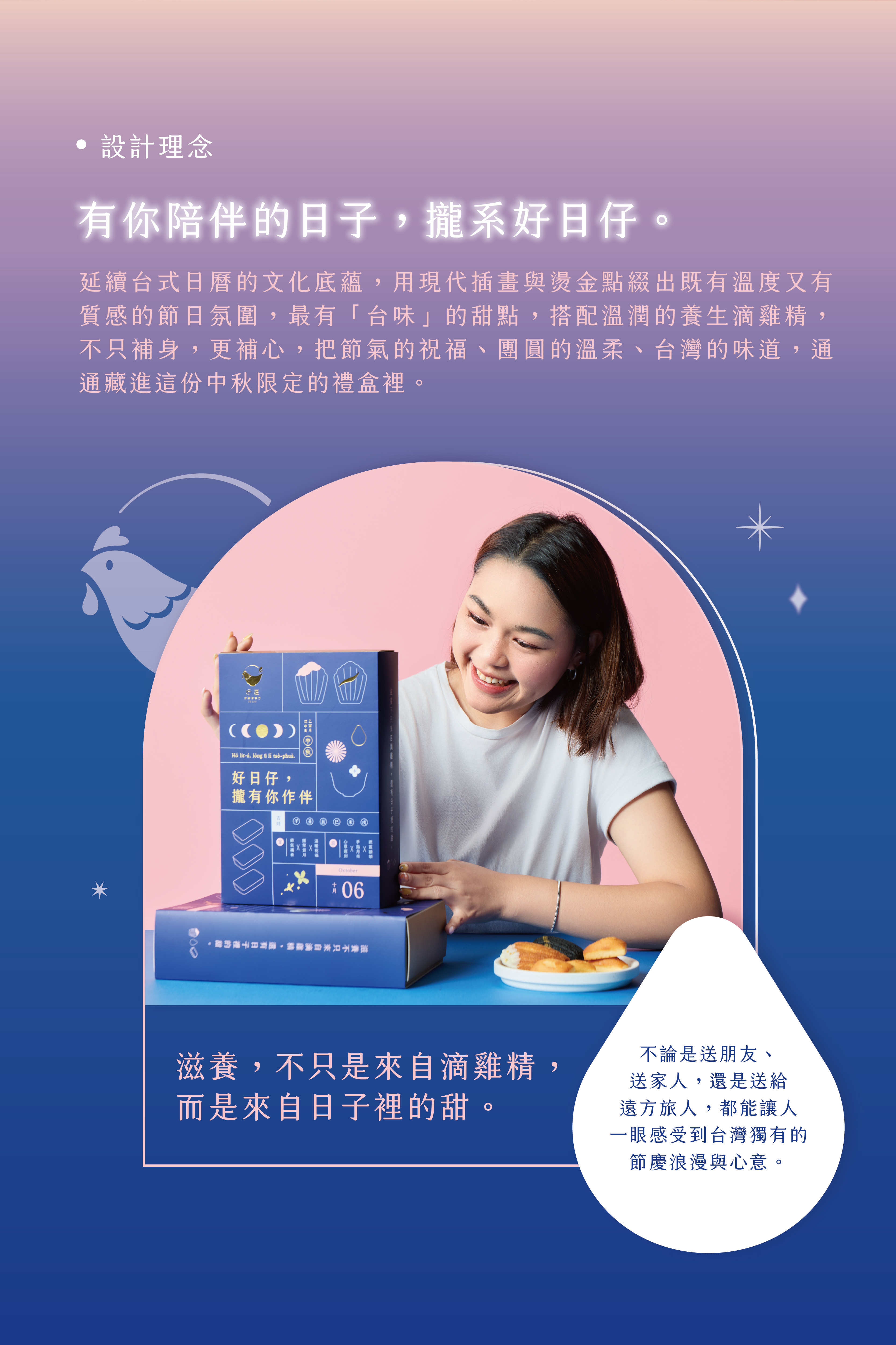好日仔,攏有你作伴滋養不只來自滴雞精,還有日子裡的甜,延續台式日曆的文化底蘊,用現代插畫與燙金點綴出既有溫度又有質感的節日氛圍,最有「台味」的甜點,搭配溫潤的養生滴雞精,不只補身,更補心,把團圓的祝福、台灣的味道,放進禮盒裡。