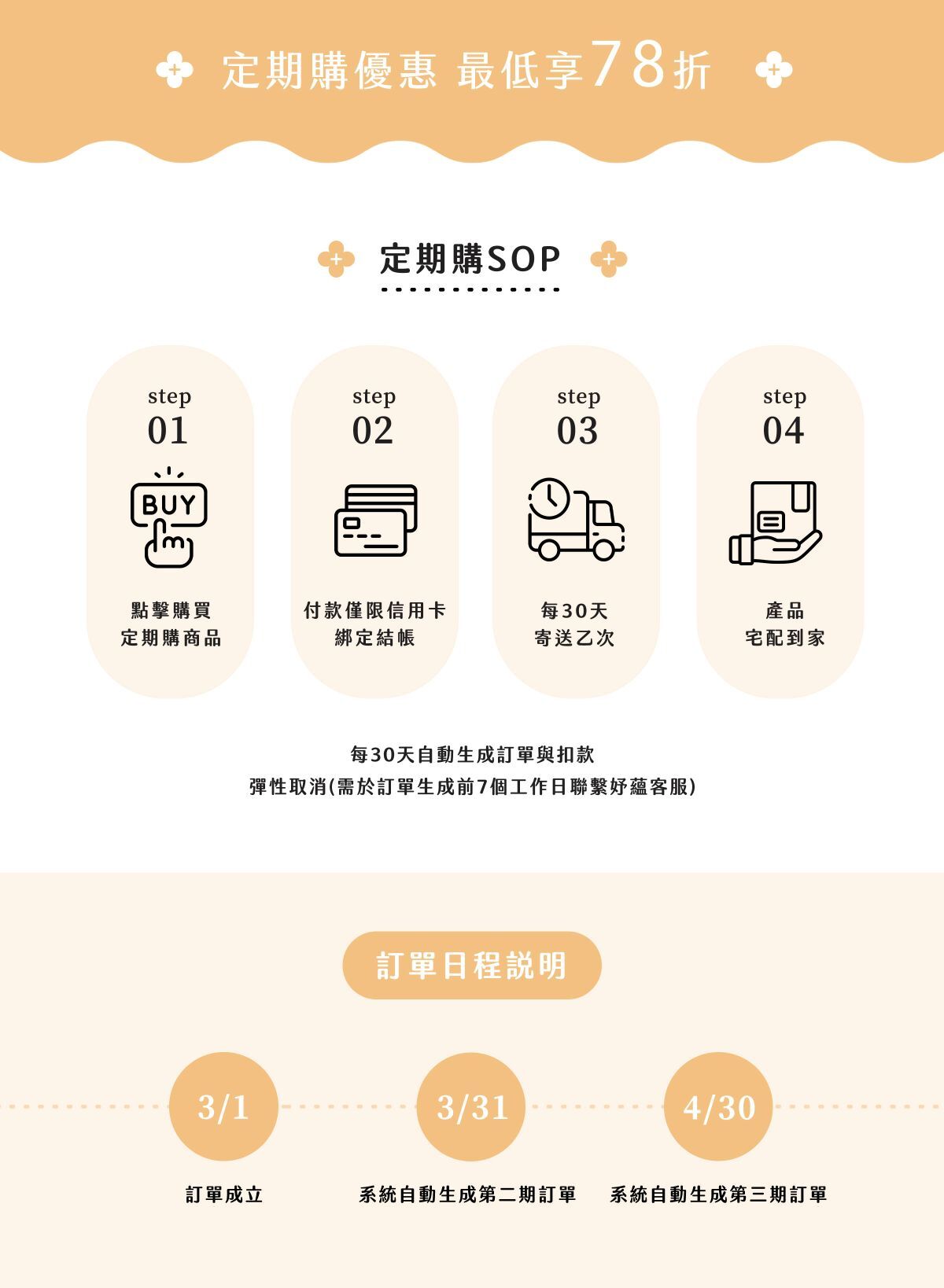 💬定期購方案已包含商品折扣優惠,恕無法參與其他優惠合併使用。第一次結帳時可使用購物金折抵,後續期數訂單為系統自動成立,故無法套用其他優惠包含購物金折抵。